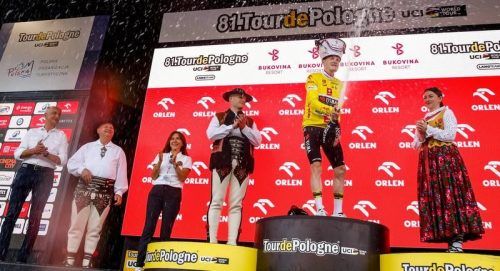 Als wäre es die Tour de France: Gelbes Trikot und Ausgelassenheit. Nur die Trachten sind bei der Polen-Rundfahrt andere. © IMAGO/Dominika Zarzycka