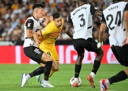 Durchgesetzt: Robert Lewandowski stellte sich den Verteidigern des FC Valencia und sorgte mit seinen beiden Treffern dafür, dass der FC Barcelona keinen Fehlstart hinlegte. © AFP/JOSE JORDAN