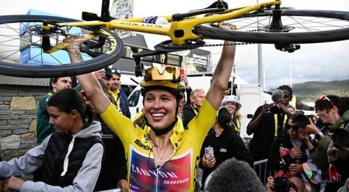 Vier Sekunden Vorsprung nach acht Etappen: Katarzyna Niewiadoma feierte, dass sie das Gelbe Trikot ins Ziel gerettet hatte. © AFP/JULIEN DE ROSA (3)