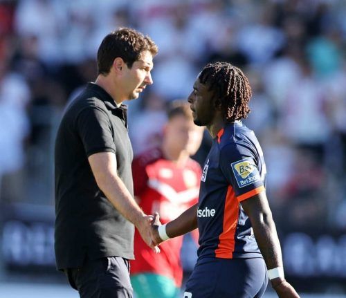 Liebt polyvalente Spieler: 1860-Trainer Argirios Giannikis mit dem variabel einsetzbaren Eliot Muteba. © Sampics / Christina Pahnke