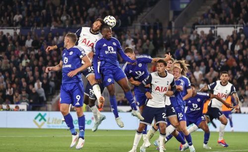 Ein heftiger Zusammenprall hat Rodrigo Bentancur (2. v. l.) kurzzeitig das Bewusstsein geraubt und in der Premier-League-Partie zwischen Tottenham Hotspur und Leicester City (1:1) für Betroffenheit gesorgt. Der uruguayische Mittelfeldspieler knallte nach einem Eckball mit dem Kopf von Gegenspieler