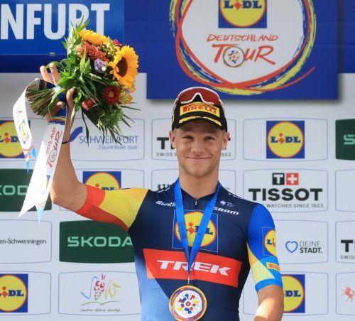 Blumen für den Schnellsten: Jonathan Milan gewann den Tour-Auftakt in Schweinfurt. © Hildenbrand/dpa
