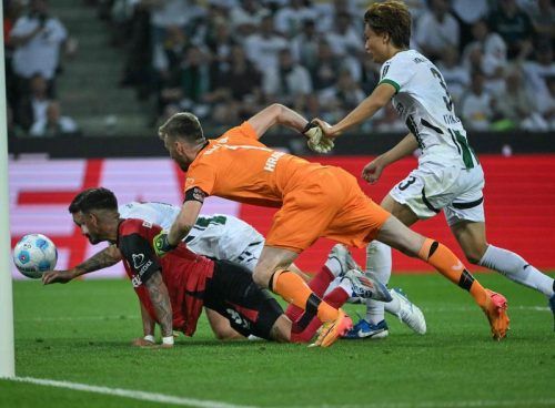Das gab Diskussionstoff: Dieses (Kopfball-)Tor von Gladbachs Tim Kleindienst (hinten) wurde aberkannt. © AFP/INA FASSBENDER