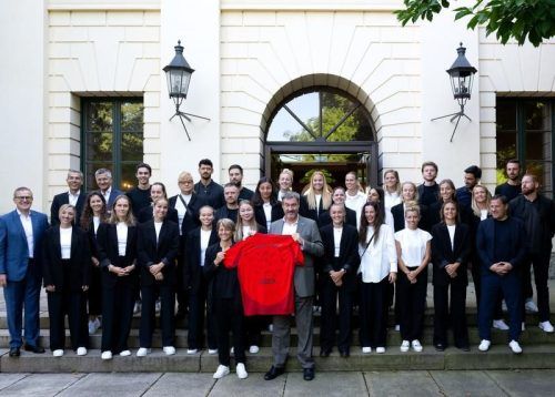 Sportvorstand Max Eberl (r. u.) wirkte etwas fehl am Platz, als die Frauen-Mannschaft des FC Bayern von Ministerpräsident Markus Söder im Prinz-Carl-Palais empfangen wurde. Das Team von Trainer Alexander Straus durfte sich nach dem Gewinn der Meisterschaft in das Goldene Buch der Staatsregierung ein