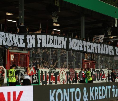 Die Trauerfeier für den am Samstag gestorbenen Fußballtrainer Christoph Daum wird am 12. September im Kölner Stadion stattfinden. Gemeinsam mit Daums früheren Clubs VfB Stuttgart (hier ein Bild aus der VfB-Fankurve beim Pokkalspiel in Münster) und Bayer Leverkusen sowie der Familie ist die Feier im