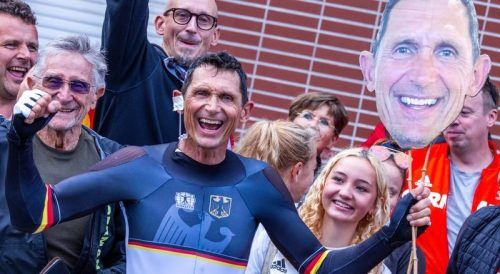 Der alte Mann ist nicht zu bremsen: Michael Teuber bejubelt mit seiner Fangemeinde Silber. © Büttner/dpa