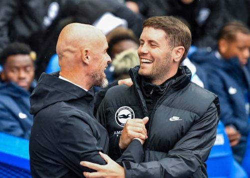 Servus, ich bin der Neue! Fabian Hürzeler mit ManU-Coach Erik ten Hag – dem er gleich drei Punkte abluchste. © Dack/Imago