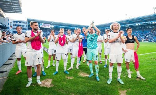 So seh‘n Sieger aus: Die 1860-Profis um Kapitän Verlaat lassen sich vom mitgereisten Anhang feiern. In Bielefeld gab es den zweite
