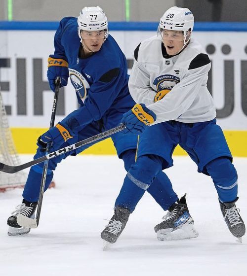 „Super aufgeregt“ ist JJ Peterka (l.) vor dem Spiel mit den Buffalo Sabres in München, seiner Stadt. Trainingsgegner ist Jiri Kulich. © dpa/Sven Hoppe