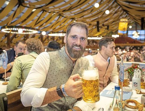 Mitten drin in der Gaudi: Ex-NFL-Star Sebastian Vollmer mit der Paulaner-Mass. © Achim Frank Schmidt (3)
