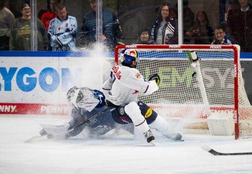 Ein wegweisendes Tor: Taro Hirose vom EHC München überwand den Straubinger Keeper Zane McIntyre kurz vor Ende des ersten Drittels zum 2:1. Am Ende gewann der EHC 6:2. © Red Bull/City-Press