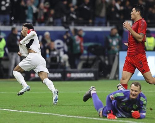 Frankfurts Marmoush dreht ab zum Jubeln, Neuer und Upamecano schauen hinterher. © IMAGO/Joaquim Ferreira