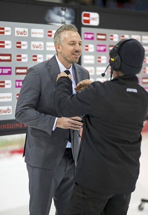 Erster Fernsehauftritt als Münchner Cheftrainer: In Bremerhaven wird Max Kaltenhauser nach dem Penalty-Sieg des EHC verkabelt. © Red Bull/City-Press