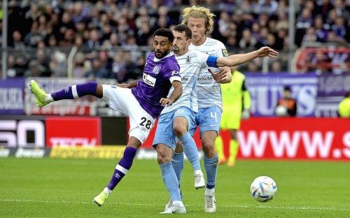 Beweglicher Stürmer: Noel Niemann bei einem Spiel mit dem VfL Osnabrück gegen den TSV 1860 (hier eng bewacht von Jesper Verlaat und Ex-Löwe Philipp Steinhart). © Imago