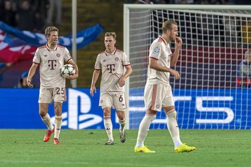 Ratlose Gesichter: Die heftige 1:4-Niederlage von Barcelona macht den Bayerrn zu schaffen. Hier ärgern sich Thomas Müller, Joshua Kimmich und Harry Kane. © IMAGO
