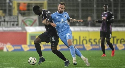 Mit Haken und Ösen: Patrick Hobsch in einem von vielen Zweikämpfen mit Osnabrücks Maxwell Gyamfi. © IMAGO