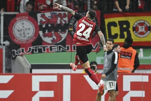 Auch über einen Pflichtsieg darf man sich freuen: Aleix Garcia feiert sein Tor zum Leverkusener 3:0 gegen Elversberg. © AFP