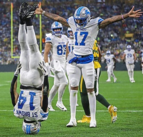 Kopfstand als Jubel: Amon-Ra St. Brown fällt gerne auf. © Imago