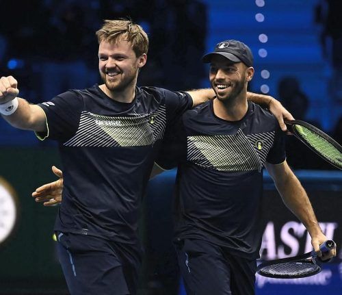 Historischer Erfolg in Turin: Kevin Krawietz (l.) und Tim Pütz haben als erstes deutsches Tennis-Doppel die ATP Finals gewonnen und zum Saisonabschluss für eine dicke Überraschung gesorgt. Das deutsche Davis-Cup-Duo setzte sich am Sonntag im dramatischen Endspiel von Turin mit 7:6 (7:5), 7:6 (8:6) g