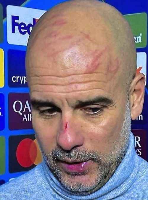 Manchester – Pep Guardiola sah aus wie nach einem Boxkampf. Dicke Striemen zeichneten seine Stirn, auf der Nase blutete gar