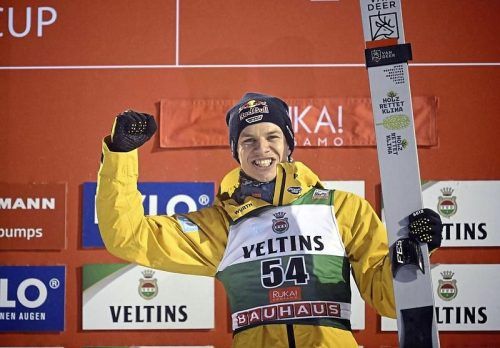 Kuusamo – Andreas Wellinger holte nach der Siegerehrung auch Pius Paschke und Karl Geiger auf das Podest, ein letztes Gruppenfoto mit Deutschland-Fahne musste schließlich noch sein. „Pius am Samsta