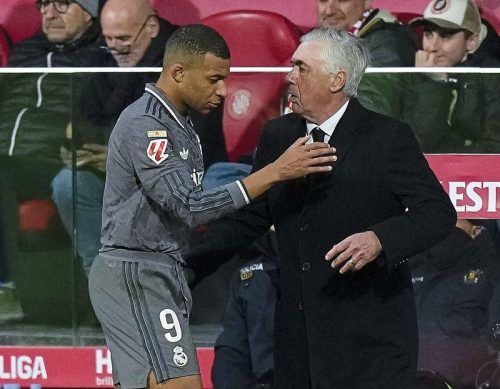 Verbale Aufbauhilfe: Real-Coach Ancelotti redet den kriselnden Mbappé stark. © epa