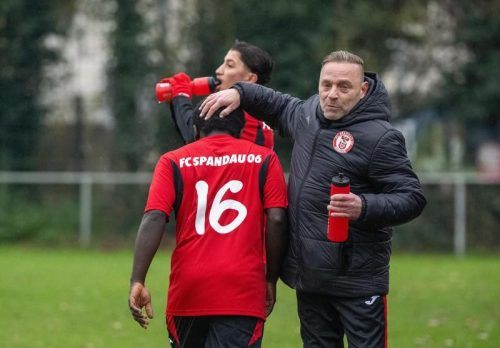 Trainer Thomas Häßler vom FC Spandau 06 bei der Auswechslung von Simon-Smith Nyuykonge Veranso. © Koch/dpa