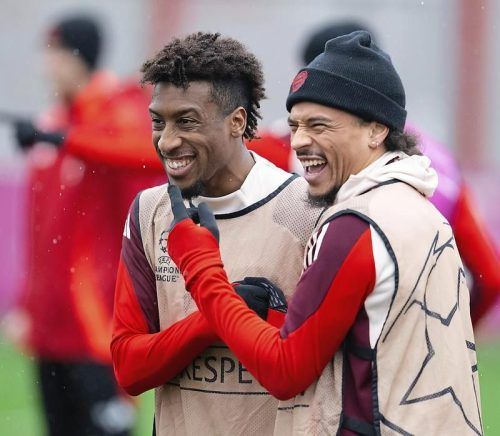 Beste Stimmung beim Abschlusstraining: Kingsley Coman und Leroy Sané scherzten an der Säbener Straße. © Sven Hoppe/dpa