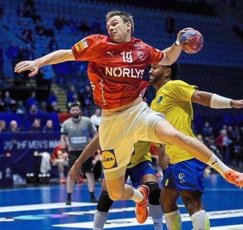 Dänemarks Handballer stürmen schier unaufhaltsam ihrem vierten WM-Titel in Serie entgegen. Die Mannschaft um Welthandballer Mathias Gidsel (AFP-Foto) deklassierte Außenseiter Brasilien im Viertelfinale mit 33:21 (15:12) und untermauerte vor dem Finalwochenende mit einer weiteren Galavorstellung ihre