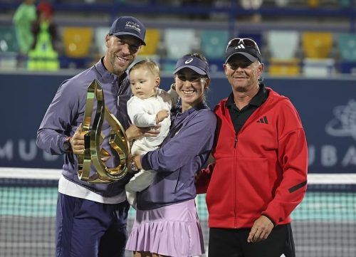 Wie ein Familienausflug: Belinda Bencic posiert mit Ehemann, Tochter und Trainer – soeben hatte die Schweizer Tennisspielerin das WTA-Turnier in Abu Dhabi gewonnen. © AFP/ALI HAIDER