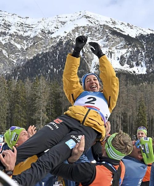 Franziska Preuß dominierte am Schießstand und lief mit der Deutschland-Fahne zum WM-Titel. © Schutt/dpa