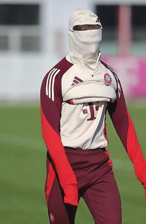 Eiskaltes Abschlusstraining: Joshua Kimmich verhüllte gleich den ganzen Kopf. © IMAGO