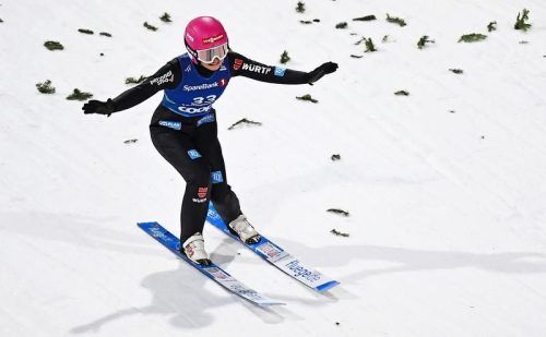 Gequälter Gesichtsausdruck nach der Landung: Nathalie Armbruster ahnte sofort, dass es mit dem WM-Podest nichts werden würde – Rang sechs. © Schmidt/dpa