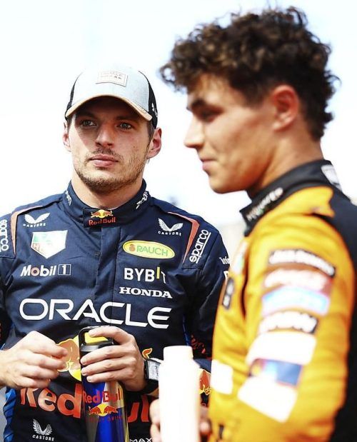 Alarmiert: Titelverteidiger Verstappen (li.) mit Lando Norris. © Thompson/AFP