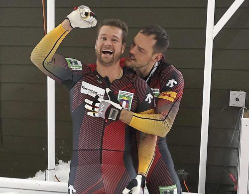 Gemeinsame Freude bei Francesco Friedrich (re.) und Anschieber Alexander Schüller. © Al Bello/AFP