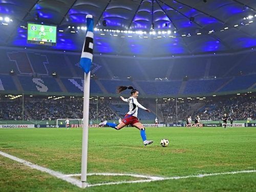 Im Viertelfinale flankte HSV-Spielerin Vildan Kardesler noch vor „nur“ knapp 17 000 Zuschauer. Für das Halbfinale im DFB-Pokal gegen den Lokal-Rivalen Werder Bremen ist das Volksparkstadion ausverkauft. © IMAGO (2)