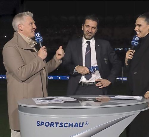 Schweinsteiger, Buffon und Sedlaczek (von links) auf dem Mailänder Rasen. © Screen: ARD