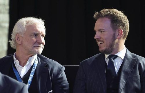 Julian Nagelsmann sitzt vor der Auslosungszeremonie für die Fußball-Weltmeisterschaft 2026 Qualifikation neben Rudi Völler, Sportdirektor der Nationalmannschaft. © Christian Charisius/dpa