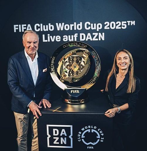 Mit der Club-WM-Trophy: Bayern-Aufsichtsrat Karl-Heinz Rummenige und DAZN-Chefin Alice Mascia.