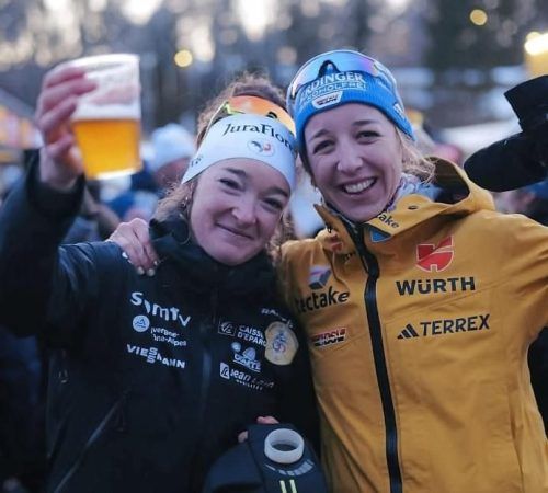 Prost! Nach dem dramatischen Rennen konnte Lou Jeanmonnot schon wieder mit Franziska Preuß lachen und feiern. © Instagram/Preuß