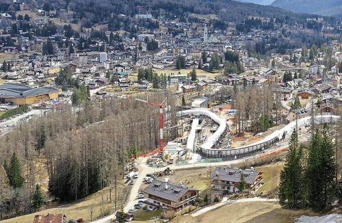 Schauplatz der Spiele: Die Bobbahn liegt wie das Curling Center (links) nah am Ort Cortina. Auf 1749 Metern geht es in 16 Kurven um die Medaille. © Bernardi/AFP