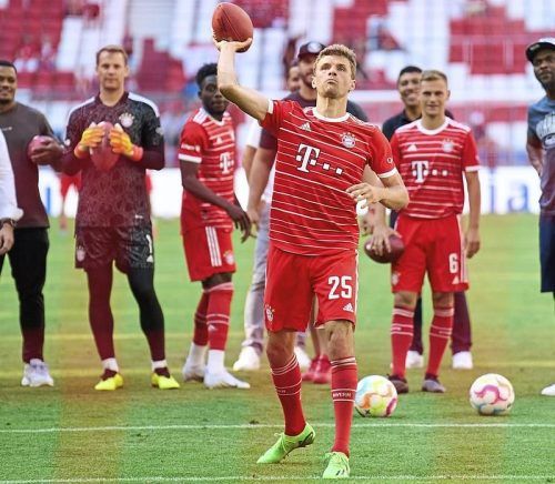 Football-Fan Thomas Müller bei einem NFL-Termin 2022 in Washington. © IMAGO