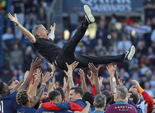 Trainer Enrique (mi.) hat die gute Laune nach Paris zurückgebracht. Nach der kurz umjubelten Meisterschaft möchte PSG jetzt auch in der Champions League triumphieren, gegen Aston Villa ist man im Viertelfinale klarer Favorit. © Fife/AFP