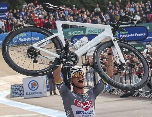 Mathieu van der Poel (l.) ließ sich im Velodrom von Roubaix feiern – kurz darauf kämpfte sich der geschlagene Tadej Pogacar (r.u.) nach einem bitteren Rennen ins Ziel: Der niederländische Klassiker-König van der Poel hat sich in der „Hölle des Nordens“ den dritten Sieg nacheinander gekrallt. Topstar