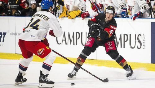 Physisch starker Mittelstürmer: Josh Samanski, hier im WM-Testspiel gegen Tschechien. © DEB/City-Press