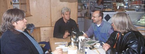 Lorants tägliche Presserunde: Der Kulttrainer mit Claudius Mayer (tz/li.), Thomas Nuggis (BILD) und einem jungen Reporter an seinem Stammplatz im Löwen-Stüberl. © Stefan Matzke