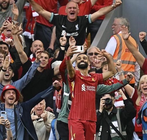 Ein Moment, der für die Ewigkeit bleibt: Mohamed Salah schießt, noch während des Spiels, nach dem 4:1 ein Selfie mit den Fans. © PAUL ELLIS