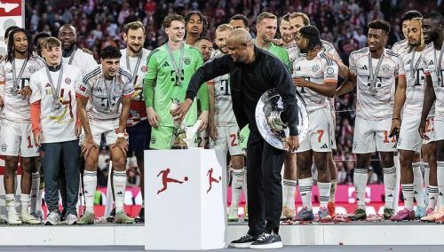 Mit Schale und Kakadu: Kompany stellte das neue Team-Maskottchen direkt auf den Trophäen-Platz. Ab diesem Moment wurde gerätselt, woher der Vogel kommt. © IMAGO