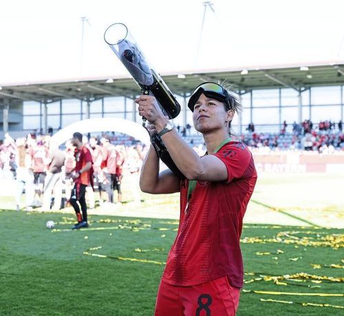 Lena Oberdorf war mittendrin. Im roten Bayern-Dress hüpfte die 23-Jährige unter dem goldenen Konfettiregen, stemmte die Meisterschale in die Höhe und feuerte mit schwarzer Ski-Brille im Gesicht wenig später die Trikot-Kanone ab. Doch während die Mittelfeldspielerin die rauschende Double-Party der Mü