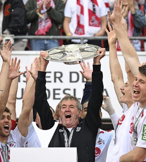 Typische Handbewegung: Friedhelm Funkel (71) stemmt die Zweitliga-Meisterschale hoch – als Nothelfer des 1. FC Köln ist er gerade zum siebten Mal in die Bundesliga aufgestiegen. © dpa